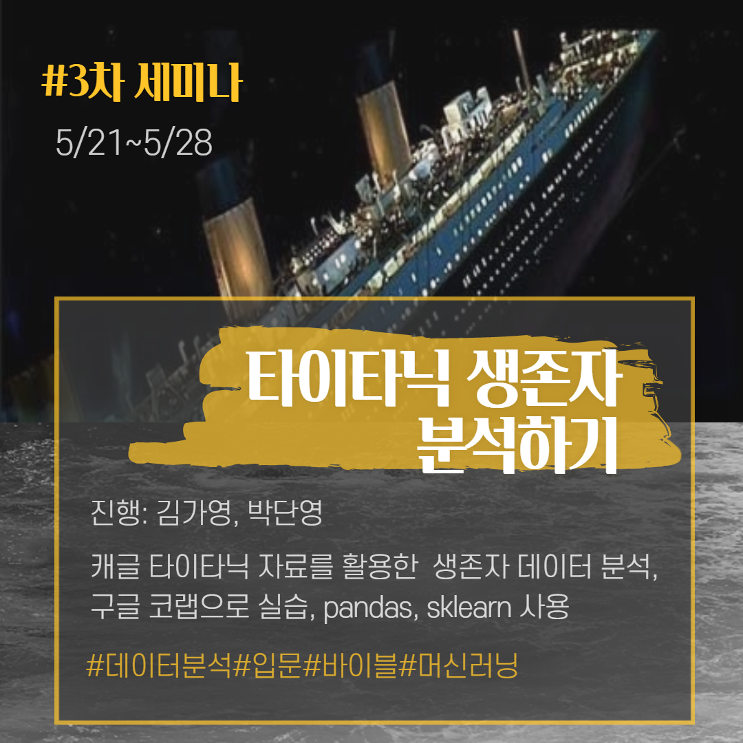 안녕하세요. 박단영님과 함께 타이타닉 생존자 분석하기 세미나를 맡은 김가영입니다.