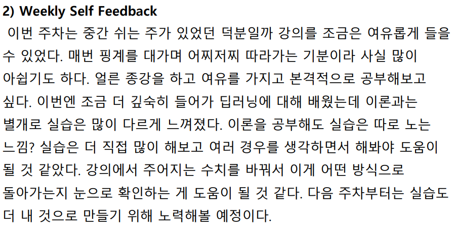 진행: 매주 학습한 분량에 대한 보고서 작성 (설명 및 실습 캡쳐본 첨부)